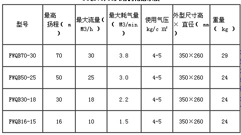 - 風動潛水泵動力部分是根據汽輪機沖擊葉輪原理,FWQB70-30風動渦輪潛水泵具有優良的空氣動力特性,氣動效率高。環形一體渦輪柵選用優質鋁合金,硬模澆鑄并經熱處理再機加工而成。FWQB70-30風動渦輪潛水泵無須象氣動馬 達那樣需加油潤滑及更換葉片,經濟利用值高。FWQB70-30風動渦輪潛水泵泵軸上下由兩只封閉軸承支承。結構簡單,平穩性能優良,能確保在額定范圍內的高轉速運行。FWQB70-30風動渦輪潛水泵泵體軸封部分二只丁型骨架橡膠密封圈,利用水氣壓使封圈內漲,增加密封效果。渦輪下端有聚氨酯防塵圈,保證了軸承部分的清潔。排氣部分采用有孔網板壓制而成,中置微孔泡沫材料,消音效果顯著,大力改善了井下降噪的工況條件。該泵是一種以壓縮空氣為介質,通過噴管進入渦輪旋轉作功,泵軸隨之高速回轉帶動泵葉輪排水。動力部分是根據汽輪機沖擊式葉輪原理,具有優良的空氣動力特性,氣動效率高。環形一體渦輪柵選用優質的鋁合金,硬模澆濤并經熱處理再機加工而成。無須象氣動馬達那樣需加油潤滑及更換維修葉片,經濟利用值一步到位。風動渦輪潛水泵風動渦輪潛水泵是一種不用電,用壓縮空氣作為動力的潛水泵,不受電源、潮濕等條件限制,特別是需要防爆的場所有著電動潛水泵不可替代的安全性和可靠性。風動渦輪潛水泵是一種高效率,高揚程的新型排水工具,風動渦輪潛水泵主要適用于礦山開拓,掘井巷道和豎井井筒施工排水作業。風動渦輪潛水泵該型號風動渦輪潛水泵是我公司多位專家、高工經研究分析,揚長避短,在原QYQ17-70型風泵基礎上,保持原產品的傳統特點進行了有重大突破的改進。風動渦輪潛水泵在動力部分采用了葉片式風動馬達,自動離心調速等機構,能確保在額定范圍內的高速運轉,風動渦輪潛水泵是礦山掘井,建井的理想排水工具。QYW系列風動排沙排污潛水泵總體結構簡單,裝拆及維護保養移動方便,在含有瓦斯與煤塵等易燃易爆的排水作業面使用絕對安全可靠,并在排氣口配置有自主知識產權的系列新型低噪消聲器(發明專利號:ZL200610097296.9),大大降低了噪音量,實測≤75db(A),大大改善了井下使用的工況條件。風動渦輪潛水泵突破了往日的設計思想,采用風動渦輪傳動、壓縮空氣為動力的新型潛水泵,克服了老式風泵噪音大、耗風量大、效率低的缺點,廣泛適用于礦山的井巷開拓、豎井井筒施工和地下峒室工程的排水施工。FWQB70-30風動渦輪潛水泵其特點:1、噪音小,保持在40分貝以內;2、耗風量少、效率高;3、風動渦輪潛水泵體積小、重量輕、結構緊湊、便于移動;4、風動渦輪潛水泵使用壽命長、易損件少、便于維修。風動渦輪潛水泵哪些型號風動潛水泵型號有BQS防爆潛水泵系列,FWQB風動渦輪潛水泵,QYW風動潛水泵。常見型號有FWQB70-30風動潛水泵,FWQB30-18風動潛水泵,FWQB50-25風動潛水泵, FWQB30-70風動潛水泵,QYW25-70風動潛水泵,FQW20-40/W,QYW17-90風動潛水泵,FQW18-30/W等一、概述 FWB35-18A型風動渦輪潛水泵是采用風動渦輪傳動,壓縮空氣為動力的新型水泵。主要應用于礦山井巷開拓、豎井井筒施工、地下室工程的排水施工。此外,凡具備有壓縮空氣各種現場施工排水,均能廣泛應用。二、風動渦輪潛水泵特點1、無級調速。只要控制節流閥開啟程序,即控制氣體流量,就可以實現無級調速。2、使用可靠,經久耐用,不受溫度及震動的影響,安裝、操作、簡單。3、設有消音裝置,噪音小,維修方便,易損件小。4、風動渦輪潛水泵具有較高的起動力矩和幾乎瞬時升到全速工作的能力。5、適應能力強。適應于排放清水、濁水(泥漿、泥砂、煤渣水),重量輕。三、風動渦輪潛水泵技術參數1、相程5-35m(雙風邊5-50m)2、流量8-28m3/ih3、工作風壓3-6kgf/cm24、耗風量3-4m3/min5、額定轉速4500r/min6、水輪直徑120mm7、進風膠管內徑25min8、排水膠管內徑50min9、噪音≤88db四、FWQB70-30風動渦輪潛水泵結構與工作原理 FWB35-18A型風動渦輪潛水泵主要由泵殼、泵軸、渦輪、限速和消音裝置等部件組成,泵殼由泵蓋、泵體組成。渦輪由葉片和輪殼輪芯等組成,水輪的密封采用兩個骨架油封封閉式密封。該泵:以壓縮空氣為動力源,壓縮空氣經進風管、噴嘴進入渦輪氣室,推動渦輪旋轉,從而驅動泵軸帶水輪旋轉進行排水工作。而余氣經消音排風罩排出,罩內的消音裝置可吸收部分噪音,大大降低了噪音對人身的危害。當水深超過水泵的高度時可在余風管上接內徑2寸半膠管,將余氣排入空中。 該泵內有限速裝置,當空載運轉時,轉速急劇增加,此時限速裝置的磨擦輪將自動漲開與摩擦套緊緊相貼,產生磨擦力達到限速的目的,使最高速度不超過7400r-min,從而避免機器損壞。當轉速降低時,磨擦輪恢復原狀,又可正常排水。五、風動渦輪潛水泵使用維護泵時必須注意以下事項1、使用該泵之前,須在地面負荷試運轉一次,風力為0.6mpa時,水泵工作十分鐘左右,檢查運轉是否正常。2、風動渦輪潛水泵使用內徑為Ø50mm膠管與排水管聯接,使用內徑Ø25mm膠管與泵進風管聯接時,應注意管接頭的清潔,避免矸石粉渣進入泵中。3、嚴禁空載運轉。因該泵是利用磨擦輪限速,空運轉就會造成摩擦發熱溫度升高而損壞零件,并引起安全事故。4、檢修后組裝渦輪上蓋時,應注意噴嘴出口一泵體反向室圓弧對齊,否則,效率較低。5、該FWQB70-30風動渦輪潛水泵使用GB491-87II號鈣基潤滑,運轉300小時左右應拆開清