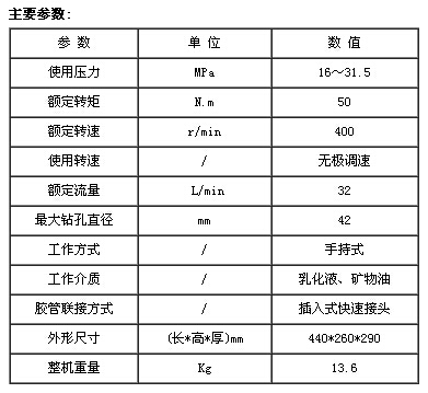 - 一、概述及用途ZRS25-50/400型手持式乳化液鉆機是以采煤工作面支護用乳化液液壓泵站為動力源,以液壓能轉化為機械能以轉矩輸出方式實施煤層鉆孔的機械。并可分為干式鉆機及濕式鉆機兩種。濕式鉆機鉆孔時其中絕大部分乳化液經回液管回到泵站繼續使用,一小部分乳化液從鉆機本身自動分出經空心鉆桿到鉆頭以實現濕式除塵(濕式鉆機需訂貨時提出)。ZRS25-50/400型手持式乳化液鉆機具有轉矩大、重量輕、鉆孔速度快,不需用電及電器綜合保護裝置,可實現安全生產。并可針對不同硬度的鉆孔物質可以做到無級調節鉆孔轉速。ZRS25-50/400型手持式乳化液鉆機適用于煤層鉆孔、礦壓鉆孔、挑頂、臥底,特別在綜采工作面使用更為方便。二、ZRS25-50/400型手持式乳化液鉆機型號含義Z: 產品類別代號-礦用回轉鉆機R: 第一特征代號-乳化液S: 第二特征代號-手持式25: 第三特征代號-最大工作壓力,單位為兆帕(MPa)50/400:主參數-額定轉矩/額定轉速,單位為 牛米(N.m)/轉每分鐘(r/min)三、ZRS25-50/400型手持式乳化液鉆機特點1、 不需用電及電器綜合保護裝置;不需增加水源及其它供水裝置可實現濕式鉆孔。2、安裝聯接使用方便;具有轉矩大、重量輕、鉆孔速度快等優點。四、ZRS25-50/400型手持式乳化液鉆機技術參數