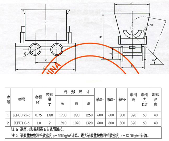 - 翻斗式礦車是煤礦中用量最大的運輸設備之一,主要用于井上、井下運輸煤、矸石、材料等,也可用于其它礦山或地下工程運輸物料。一般由電機車、絞車牽引,具有耐沖擊,運輸安全、可靠,大容積等特點。翻斗式礦車適用于煤炭、金屬、非金屬礦山或建筑工地,是用來運輸碎塊狀等松散物料的運輸車輛。如煤炭、礦石、渣石和石料等。其基本組成為:車廂、車架、緩沖器及行走機構等組成,該KFU0.55-6型翻斗式礦車的主要形式結構為:在由鋼板焊接而成的車廂兩端各裝設有一個弧形滾圈,支撐在車架的翻轉軌上,通過人力打開車廂的止動裝置后,稍加外力便可使車廂向車體兩側任意翻轉進行卸載,其卸載傾角可達40°以上。翻斗式礦車概述: 翻斗式礦車車箱斷面為V形或U形,支承在車架的翻轉軌上,車箱在翻轉軌上翻轉卸載。 翻斗式礦車分為大碰頭和小碰頭,大碰頭一般都是全錨的,而小碰頭一般都是焊接的。 翻斗式礦車主要型號包括:KFU0.55-6翻斗式礦車,KFU0.75-6型翻斗式礦車。 注:翻斗式礦車也可根據用戶要求,制做各式異型礦車。翻斗式礦車用途: 翻斗式礦車被廣泛用于煤礦、金礦、鐵礦、石膏礦等礦山行業。在礦山或建筑工地上,用來運輸碎的塊狀物料,例如:礦石、煤炭、石頭等等。翻斗式礦車特點:1、翻斗式礦車結構簡單,堅固耐用,只要人力打開止動板,就能很容易地卸下物料。2、翻斗式礦車相對來說自動化程度很高,輪軸采用了滾柱軸承,有效地減少了運行阻力,因此用機車或人力均能牽引或推動。3、KFU0.55-6型翻斗式礦車不需用任何輔助設施,可左右自動翻轉,使用靈活、輕便。翻斗式礦車的結構組成:翻斗式礦車是由車箱、車架、緩沖碰頭、輪軸等組成。1、車箱:由箱板、端蓋、口邊角鋼等焊接組成。2、車架:由槽鋼、翻斗式礦車-角鋼、碰頭、軸卡等焊接組成。3、輪對:由車輪、軸、軸承等組成。4、連接插銷:由Φ40mm優質碳結元鋼,手提環焊接組成。KFU0.55-6型翻斗式礦車型號表示含義: 例:KFU0.75-6翻斗式礦車1、 K:表示煤礦車輛;2、 F:表示翻斗式礦車;3、 U:表示該車車箱的形狀;4、 0.75:表示該車的容積為0.75m³;5、 6:表示該車所使用的軌距為600mm。KFU0.55-6型翻斗式礦車保養與維護為保證礦車的正常行駛和延長使用壽命,需要每天檢查,每月維修,必須保證車輪無卡滯及不轉動現象。 應按照輪對的日常維護要求定期填加潤滑油,保證良好的潤滑,定期清除煤泥,及其它附屬物,保證足夠的容量;檢查防脫插銷是否有彎曲、裂紋等缺陷;檢查緊固件上的螺栓是否松動等,防止發生意外。 此外還要隨時更換易損壞零配件。KFU0.55-6型翻斗式礦車注意事項1、使用過程中,礦車所受的負荷不準超過規定的數值。2、聯接裝置發生故障時禁止工作。3、車架在震動時剛性地沖撞輪軸,禁止在車底架與輪對有故障時使用以免損壞車軸。4、如發現插銷、三環鏈表面嚴重銹蝕或嚴重變形應報廢。5、禁止礦車剛碰頭相互接觸。6、當礦車軌道變形時應及時調整,否則礦車輪對易損,運輸過程中容易跳道。KFU0.55-6型翻斗式礦車KFU0.55-6型翻斗式礦車是我公司是全國重要的礦車專業生產廠家之一,主要生產KFU0.55-6型翻斗式礦車0.55立方米、 0.75立方米、0.85立方米、1.1立方米V型翻斗式礦車,0.7立方米、1.1立方米、1.5立方米U型固定式礦車,0.7立方米、1.2立方米側卸式礦車及1.5噸、3噸底卸式礦車。KFU0.55-6型翻斗式礦車廣泛用于煤礦、金礦、鐵礦、石膏礦等礦山行業,也可根據用戶要求,制做各式異型礦車,公司生產的 翻斗式礦車,堅固耐用,使用靈活,深受廣大用戶好評。KFU0.55-6型翻斗式礦車的主要技術參數: